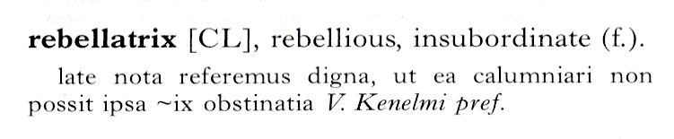 The DMLBS’s only example of the word ‘rebellatrix’, which we define as ‘rebellious, insubordinate (applied to a female person or feminine noun)’, is found here (four lines from the top). Here it is an adjective, but interestingly, the masculine form, ‘rebellator’, appears only as a noun, and in much later sources.